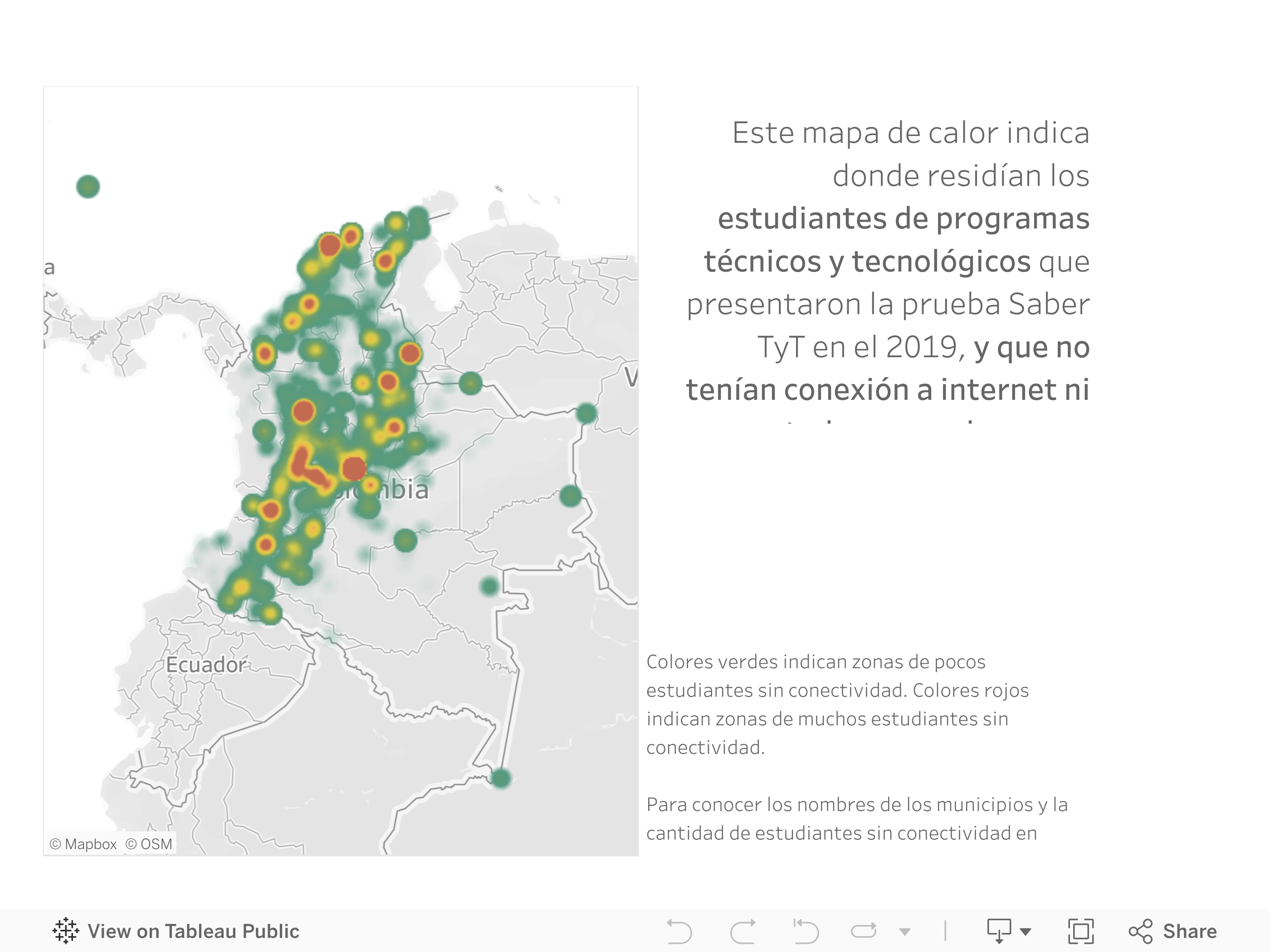 Como se muestran en el mapa, los estudiantes desconectados se distribuyen por todo el país. Sin embargo, hay altas concentraciones de estos en zonas urbanas como Bogotá, el Eje Cafetero, Barranquilla, Santa Marta y el Valle de Aburrá.